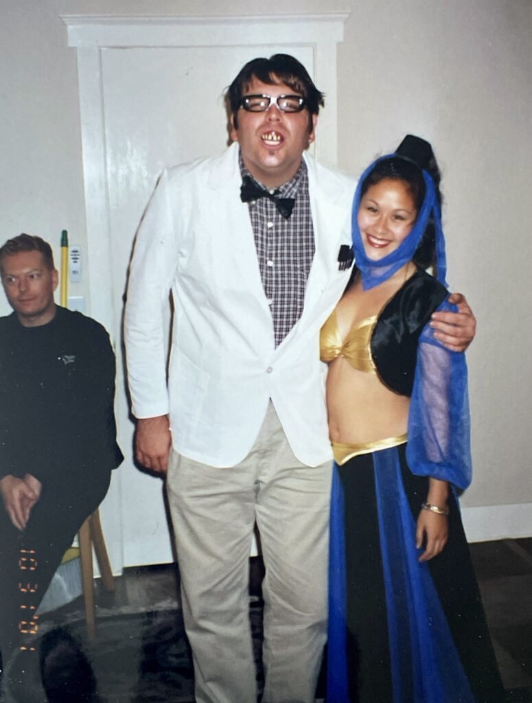 As The Nutty Professor with NICOLE TAKESONO as The Genie as an unimpressed  PAUL LINNES looks on at the COSI FAN TUTTE Halloween Party in October 2001